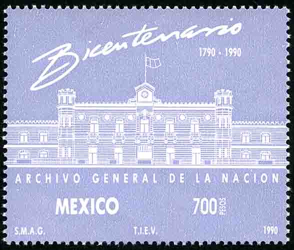 No. Scott: 1643 -- Año de Emisión: 1990 -- Valor facial: Setecientos Pesos -- Variedad de color: Gris Azuloso -- Perforación:14 -- Tipo de impresión: Huecograbado Timbre Postal Mexicano en color gris azuloso, en la imagen se observa la fachada del edificio del Archivo General de la Nación, en la parte superior está escrito "Bicentenario 1790-1990", en la parte inferior "MEXICO" y el valor facial de "700 PESOS". Para más información favor de dirigirse a biblioteca@mufi.org.mx