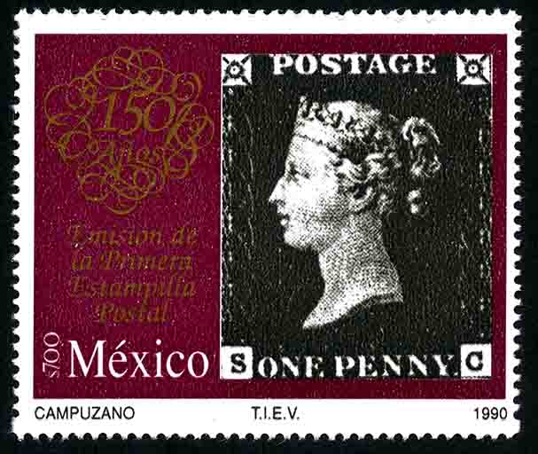 No. Scott: 1646 -- Año de Emisión: 1990 -- Valor facial: Setecientos Pesos -- Variedad de color: Violeta Oscuro, Negro y Oro -- Perforación:14 -- Tipo de impresión: Huecograbado Timbre Postal Mexicano en colores violeta oscuro, negro y oro, del lado izquierdo de la imagen está escrito "150 Emisión de la Primera Estampilla Postal", el valor facial de "$700" y "MEXICO", del lado derecho se observa el primer timbre del mundo, el Penny Black de la Reina Victoria, la palabra "POSTAGE" en la parte superior y en la inferior "ONE PENNY". Para más información favor de dirigirse a biblioteca@mufi.org.mx