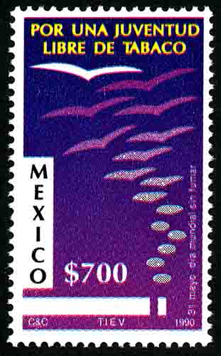 No. Scott: 1650 -- Año de Emisión: 1990 -- Valor facial: Setecientos Pesos -- Variedad de color: Violeta, Amarillo y Negro -- Perforación:14 -- Tipo de impresión: Huecograbado Timbre Postal Mexicano en colores violeta, amarillo y negro, en la imagen aparerecen diferentes figuras flotando, la primera de arriba hacia abajo, en mi opinión es una paloma en color blanco, en la parte superior está escrito "POR UNA JUVENTUD LIBRE DE TABACO", en el lado lateral izquierdo aparece la palabra "MEXICO" y al final el valor facial de "$700". Para más información favor de dirigirse a biblioteca@mufi.org.mx