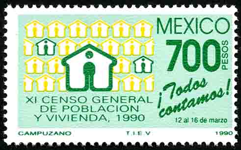 No. Scott: 1641 -- Año de Emisión: 1990 -- Valor facial: Setecientos Pesos -- Variedad de color: Verde Claro y Amarillo -- Perforación:14 -- Tipo de impresión: Huecograbado Timbre Postal Mexicano en colores verde claro y amarillo, en la imagen se observa el logotipo del XI Censo General de Población y Vivienda 1990, representado por casas y personas que aparecen en ellas, del lado lateral derecho está escrito "MEXICO", el valor facial de "700 PESOS y la frase "Todos Contamos". Para más información favor de dirigirse a biblioteca@mufi.org.mx