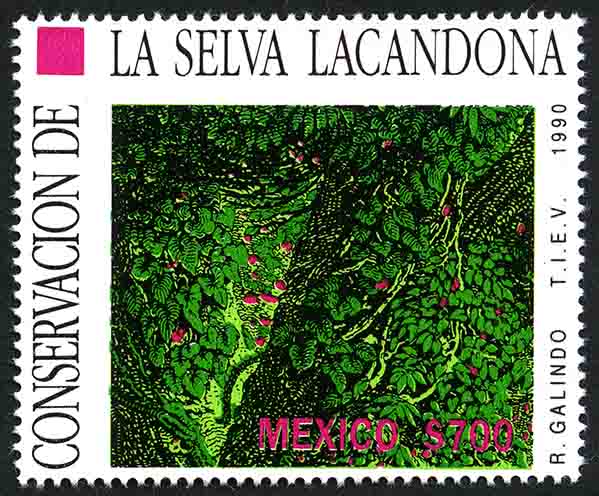 No. Scott: 1655 -- Año de Emisión: 1990 -- Valor facial: Setecientos Pesos -- Variedad de color: Verde, Negro, Rojo -- Perforación:14 -- Tipo de impresión: Huecograbado Timbre Postal Mexicano en colores verde, negro y rojo, en la imagen se observa un terreno extenso y lleno de árboles y con vegetación muy densa, en el contorno de la estampilla está escrito "CONSERVACION DE LA SELVA LACANDONA", en la parte inferior "MEXICO" y el valor facial de "$700". Para más información favor de dirigirse a biblioteca@mufi.org.mx