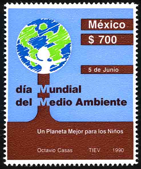 No. Scott: 1651 -- Año de Emisión: 1990 -- Valor facial: Setecientos Pesos -- Variedad de color: Azul, Café Rojizo y Verde -- Perforación:14 -- Tipo de impresión: Huecograbado Timbre Postal Mexicano en colores azul, café rojizo y verde, en la imagen se observa la silueta de un niño dentro de un globo terráqueo, sobre la estampilla está escrito "MEXICO", el valor facial de "$700", "5 de junio", en el centro "Día Mundial del Medio Ambiente" y en la parte inferior "Un Planeta Mejor para los Niños". Para más información favor de dirigirse a biblioteca@mufi.org.mx