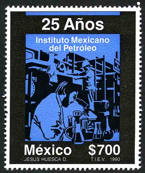 No. Scott: 1659 -- Año de Emisión: 1990 -- Valor facial: Setecientos Pesos -- Variedad de color: Azul y Negro -- Perforación:14 -- Tipo de impresión: HuecograbadoTimbre Postal Mexicano en colores azul y negro, en la imagen se observa, un espacio con anaquéles y material de trabajo, en el cual aparecen dos hombres, uno de ellos está parado, como si estuviera acomodando algo, trae puesto un casco en la cabeza, en primer plano hay otro hombre sentado, viendo algo a través de un microscópio, al lado de él, aparecen varios accesorios de laboratorio, en la parte superipor está escrito "25 Años", "Instotuto Mexicano del Petróleo, en la parte inferior "MEXICO" y el valor facial de "$700".