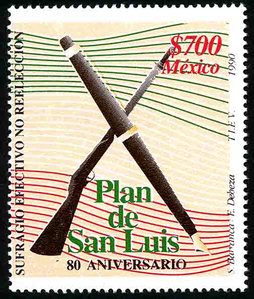 No. Scott: 1666 -- Año de Emisión: 1990 -- Valor facial: Setecientos Pesos -- Variedad de color: Naranja, Verde, Negro y Rojo -- Perforación:14 -- Tipo de impresión: Huecograbado Timbre Postal Mexicano en colores naranja, verde, negro y rojo, al fondo de la imagen se observan líneas delgadas en colores verde, blanco y rojo, en primer plano hay un rifle y una pluma estilográfica formando una "X", en la parte superior del lado derecho está escrito el valor facial de "$700", "MEXICO" en el contorno del lado izquierdo "SUFRAGIO EFECTIVO, NO REELECCIÓN", en la parte inferior "Plan de San Luis" y "80 Aniversario". Para más información favor de dirigirse a biblioteca@mufi.org.mx