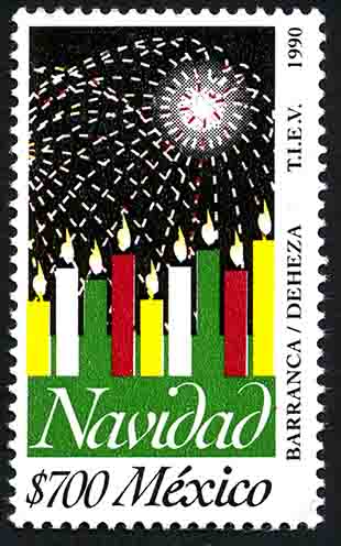 No. Scott: 1675 -- Año de Emisión: 1990 -- Valor facial: Setecientos Pesos -- Variedad de color: Negro, Verde, Amarillo y Rojo -- Perforación:14 -- Tipo de impresión: Huecograbado Timbre Postal Mexicano en colores negro, verde, amarillo y rojo, en la imagen se observan nueve velas encendidas en diferentes tamaños y colores, así como muchas luces blancas en el cielo, posiblemente sean objetos pirotécnicos, en la parte inferior está escrito "Navidad", el valor facial de "$700" y la palabra "MEXICO". Para más información favor de dirigirse a biblioteca@mufi.org.mx
