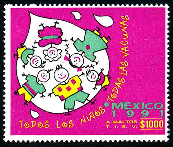 No. Scott: 1687 -- Año de Emisión: 1991 -- Valor facial: Mil Pesos -- Variedad de color: Magenta, Verde, Amarillo y Negro -- Perforación:14 -- Tipo de impresión: Huecograbado Timbre Postal Mexicano en colores magenta, verde, amarillo y negro, en la imagen se observan seis niños dentro de una gota de gran tamaño, por la parte de afuera aparecen tres gotas pequeñas, sobre la estampilla está escrito "TODOS LOS NIÑOS TODAS LAS VACUNAS", "MEXICO 1991" y el valor facial de "$1000". Para más información favor de dirigirse a biblioteca@mufi.org.mx