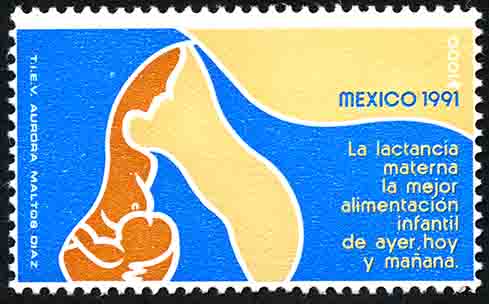 No. Scott: 1691 -- Año de Emisión: 1991 -- Valor facial: Mil Pesos -- Variedad de color: Azul, Crema y Naranja -- Perforación:14 x 14 1/2 -- Tipo de impresión: Huecograbado Timbre Postal Mexicano en colores azul, crema y naranja, en la imagen se observa el perfil de una mujer, sosteniendo en brazos a un bebé, también está escrito el valor facial de "$1000", "MEXICO", y "La lactancia materna la mejor alimentación infantil de ayer, hoy y mañana". Para más información favor de dirigirse a biblioteca@mufi.org.mx