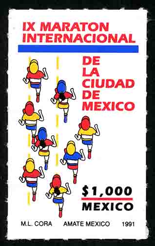 No. Scott: 1702 -- Año de Emisión: 1991 -- Valor facial: Mil Pesos -- Variedad de color: Rojo, Azul, Amarillo y Negro -- Perforación: 6 1/2 -- Tipo de impresión: Offset Timbre Postal Mexicano en colores rojo, azul, amarillo y negro, la imagen nos muestra una toma aérea de ocho personas que van corriendo, mismos que visten con ropa deportiva, al parecer, todos llevan puesta una gorra en la cabeza, en la parte superior de la imagen está escrito "IX MARATON INTERNACIONAL DE LA CIUDAD DE MEXICO", en la parte inferior el valor facial de "$1000" y la palabra "MEXICO". Para más información favor de dirigirse a biblioteca@mufi.org.mx
