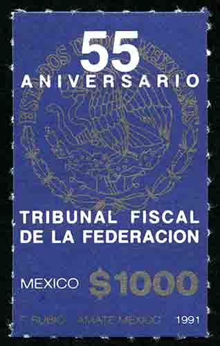 No. Scott: 1703 -- Año de Emisión: 1991 -- Valor facial: Mil Pesos -- Variedad de color: Azul Oscuro y Plata -- Perforación: 6 1/2 -- Tipo de impresión: Offset Timbre Postal Mexicano en colores azul oscuro y plata, al fondo de la imagen y en color plata se observa el Escudo Nacional Mexicano, en primer plano y en color blanco está escrito "55 ANIVERSARIO", "TRIBUNAL FISCAL DE LA FEDERACIÓN", al final "MEXICO" y el valor facial de "$1000". Para más información favor de dirigirse a biblioteca@mufi.org.mx