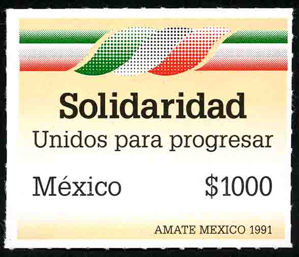 No. Scott: 1705 -- Año de Emisión: 1991 -- Valor facial: Mil Pesos -- Variedad de color: Verde Olivo, Negro, Verde y Rojo -- Perforación: 6 1/2 -- Tipo de impresión: Offset Timbre Postal Mexicano en colores verde olivo, negro, verde y rojo, arriba de la imagen aparece el logotipo de Solidaridad, representado por los colores verde, blanco, rojo y negro, sobre la estampilla está escrito "SOLIDARIDAD", "Unidos para progresar", "MEXICO" y el valor facial de "$1000". Para más información favor de dirigirse a biblioteca@mufi.org.mx