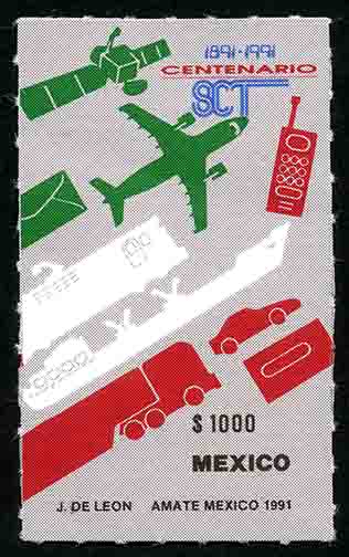 No. Scott: 1694 -- Año de Emisión: 1991 -- Valor facial: Mil Pesos -- Variedad de color: Gris, Rojo, Verde, Azul y Negro -- Perforación: 6 1/2 -- Tipo de impresión: Offset Timbre Postal Mexicano en colores gris, rojo, verde, azul y negro, en la imagen se observan diferentes medios de comunicación como el avión, correo, teléfono, barcos, camiones y autos, en la parte superior aparece escrito "1891-1991, CENTENARIO SCT", en la parte inferior el valor facial de "$1000" y la palabra "MEXICO". Para más información favor de dirigirse a biblioteca@mufi.org.mx
