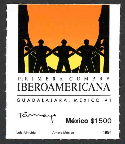 No. Scott: 1700 -- Año de Emisión: 1991 -- Valor facial: Mil Quinientos Pesos -- Variedad de color: Naranja, Negro y Amarillo -- Perforación: 6 1/2 -- Tipo de impresión: OffsetTimbre Postal Mexicano en colores naranja, negro y amarillo, en la imagen se observa una pintura de Rufino Tamayo titulada "El Fuego Nuevo de la Hermandad", al fondo aparecen los colores rojo y amarillo, representando el fuego, en primer plano hay figuras humanas con los brazos entrelazados y de espaldas, con la mairada hacia el fuego, representando la hermandad, sobre la estampilla aparece escrito "PRIMERA CUMBRE IBEROAMERICANA GUADALAJARA, MEXICO 91", la palabra "MEXICO" y el valor facial de "$1500".