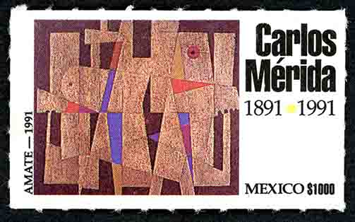 No. Scott: 1712 -- Año de Emisión: 1991 -- Valor facial: Mil Pesos -- Variedad de color: Multicolor -- Perforación: 6 1/2 -- Tipo de impresión: Offset Timbre Postal Mexicano multicolor, en la imagen se observa una obra del pintor guatemalteco Carlos Mérida, titulada "El Ojo del Adivino", representada por un mural de mosaico, en la cual plasma su arte abstracta y geométrica, del lado derecho está escrito "CARLOS MÉRIDA 1891-1991", la palabra "MEXICO" y el valor facial de "$1000". Para más información favor de dirigirse a biblioteca@mufi.org.mx