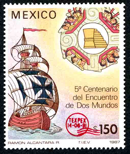 No. Scott: 1698 -- Año de Emisión: 1991 -- Valor facial: Ciento Cincuenta Pesos -- Variedad de color: Multicolor -- Perforación:14 x 14 1/2 -- Tipo de impresión: Huecograbado Timbre Postal Mexicano multicolor, del lado izquierdo de la imagen se observa una embarcación larga, alta, ligera, con una sola cubierta y tres palos con velas, también aparece un dibujo indígena, sobre la estampilla está escrito "MEXICO", "5o. Centenario del Encuentro de Dos Mundos" y el valor facial de "150.00". Para más información favor de dirigirse a biblioteca@mufi.org.mx