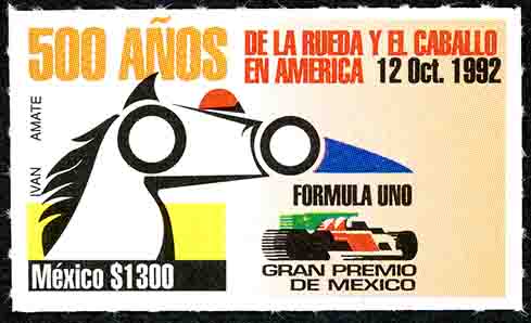 No. Scott: 1722 -- Año de Emisión: 1992 -- Valor facial: Mil Trescientos Pesos -- Variedad de color: Multicolor -- Perforación: 6 1/2 -- Tipo de impresión: Offset Timbre Postal Mexicano multicolor, en la imagen se observa la figura de un caballo, cuyos ojos están representados por dos ruedas grandes, al final de la cara aparece un triángulo en color azul, sobre la estampilla está escrito "500 AÑOS DE LA RUEDA Y EL CABALLO EN AMÉRICA", "MEXICO" y el valor facial de "$1300". Para más información favor de dirigirse a biblioteca@mufi.org.mx