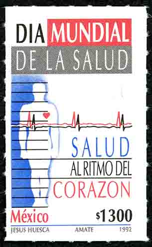 No. Scott: 1724 -- Año de Emisión: 1992 -- Valor facial: Mil Trescientos Pesos -- Variedad de color: Azul, Rojo, Gris y Negro -- Perforación: 6 1/2 -- Tipo de impresión: Offset Timbre Postal Mexicano en colores azul, rojo, gris y negro, en la imagen se observa una silueta humana, resaltando el corazón de color rojo, sobre la imagen está escrito "DÍA MUNDIAL DE LA SALUD", "SALUD AL RITMO DEL CORAZÓN", la palabra "MEXICO " y el valor facial de "$1300". Para más información favor de dirigirse a biblioteca@mufi.org.mx