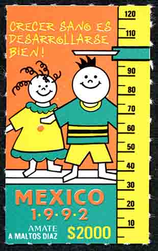 No. Scott: 1721 -- Año de Emisión: 1992 -- Valor facial: Dos Mil Pesos -- Variedad de color: Naranja, Verde, Amarillo y Negro -- Perforación: 6 1/2 -- Tipo de impresión: Offset Timbre Postal Mexicano en colores naranja, verde, amarillo y negro, en la imagen se observan una niña y un niño midiéndose la altura, en la parte superior está escrito "CRECER SANO ES DESARROLLARSE BIEN", en la parte inferior "MEXICO 1992" y el valor facial de "$2000". Para más información favor de dirigirse a biblioteca@mufi.org.mx