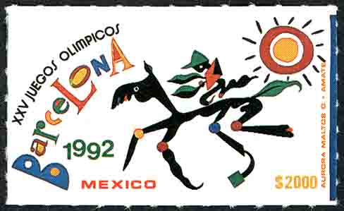 No. Scott: 1718 -- Año de Emisión: 1992 -- Valor facial: Dos Mil Pesos -- Variedad de color: Multicolor -- Perforación: 6 1/2 -- Tipo de impresión: Offset Timbre Postal Mexicano Multicolor, en el cuál se observa una imagen surrealista, dándole forma a un animal en movimiento con cuatro patas, cuello y cola larga, encima de él, una persona con las piernas dobladas, manos extendidas y con una gorra en la cabeza, en la parte superior del lado derecho se aprecia un sol muy colorido, sobre la estampilla está escrito "XXV JUEGOS OLIMPICOS Barcelona 1992", en la parte inferior "MEXICO" y el valor facial de "$2000". Para más información favor de dirigirse a biblioteca@mufi.org.mx