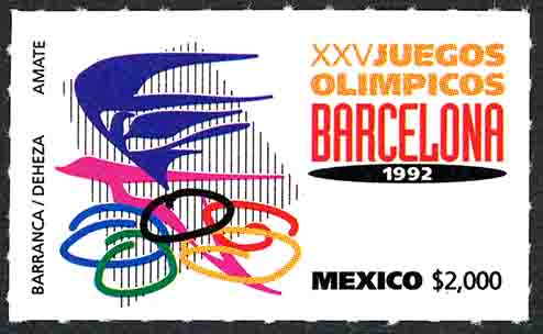 No. Scott: 1719 -- Año de Emisión: 1992 -- Valor facial: Dos Mil Pesos -- Variedad de color: Multicolor -- Perforación: 6 1/2 -- Tipo de impresión: Offset Timbre Postal Mexicano multicolor, del lado izquierdo se observa una imagen surrealista, representada por una variedad de líneas rectas verticales, oblícuas y onduladas, en diferentes colores y tamaños, del lado derecho está escrito "XXV JUEGOS OLÍMPICOS BARCELONA 92", al final "MEXICO" y el valor facial de "$2000". Para más información favor de dirigirse a biblioteca@mufi.org.mx