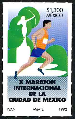 No. Scott: 1749 -- Año de Emisión: 1992 -- Valor facial: Mil Trescientos Pesos -- Variedad de color: Azul, Verde, Naranja y Negro -- Perforación: 5 -- Tipo de impresión: Offset Timbre Postal Mexicano en colores azul, verde, naranja y negro, la imagen nos muestra la silueta de una mujer sujetando un arco con la mano derecha, en primer plano aparece un hombre corriendo, lleva puesta una playera, un short y zapatos negros, en la parte superior de la imagen está escrito el valor facial de "$1300", "MEXICO" y en la parte inferior "X MARATON INTERNACIONAL DE LA CIUDAD DE MEXICO". Para más información favor de dirigirse a biblioteca@mufi.org.mx