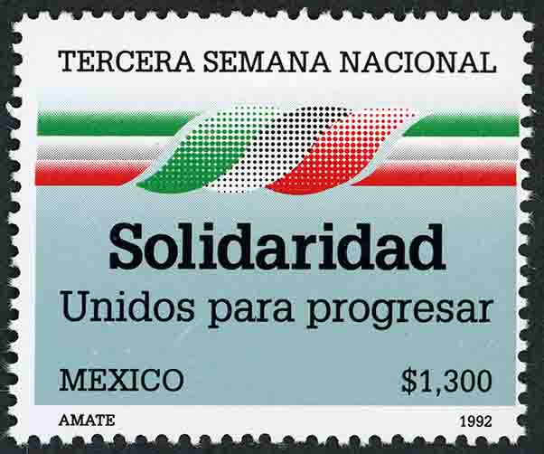 No. Scott: 1750 -- Año de Emisión: 1992 -- Valor facial: Mil Trescientos Pesos -- Variedad de color: Azul, Negro, Verde, Rojo y Gris -- Perforación: 10 -- Tipo de impresión: Offset Timbre Postal Mexicano en colores azul, negro, verde, rojo y gris, arriba de la imagen está escrito "TERCERA SEMANA NACIONAL", más abajo, el logotipo de Solidaridad representado por los colores verde, blanco, rojo y negro, sobre la estampilla está escrito "SOLIDARIDAD", "Unidos para progresar",al final, el valor facial de "$1300" y la palabra "MEXICO". Para más información favor de dirigirse a biblioteca@mufi.org.mx