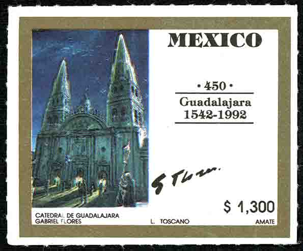 No. Scott: 1720-c -- Año de Emisión: 1992 -- Valor facial: Mil Trescientos Pesos -- Variedad de color: Multicolor -- Perforación: 6 1/2 -- Tipo de impresión: Offset Timbre Postal Mexicano multicolor, al fondo de la imagen y del lado izquierdo se observa la fachada de de una iglesia, alfrente aparecen las siluetas de algunas personas, del lado derecho está escrito "MEXICO", "450 Guadalajara 1542-1992" y el valor facial de "$1300". Para más información favor de dirigirse a biblioteca@mufi.org.mx