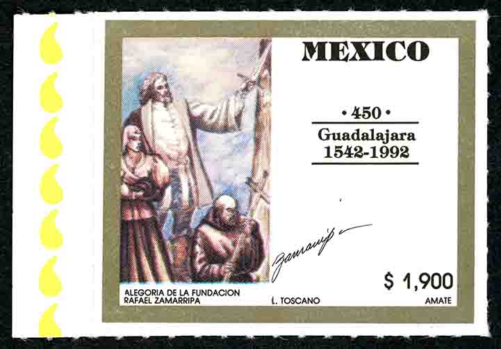 No. Scott: 1720-d -- Año de Emisión: 1992 -- Valor facial: Mil Novecientos Pesos -- Variedad de color: Multicolor -- Perforación: 6 1/2 -- Tipo de impresión: OffsetTombre Postal Mexicano multicolor, del lado izquierdo de la imagen se observan tres personas, dos hombres y una mujer, un hombre está parado, sosteniendo un objeto en forma de espada conuna mano, a su lado, hay una mujer, ella está con los brazos cruzados, parece tener algo entre las manos, pero no se aprecia que es, ambos portan verstuario colonial, enfrente de ellos aparece un hombre incado, vestido de religioso y sosteniendo una cruz con ambas manos, del lado derecho está escrito "MEXICO", "450 Guadalajara 1542-1992" y el valor facial de "$1900".
