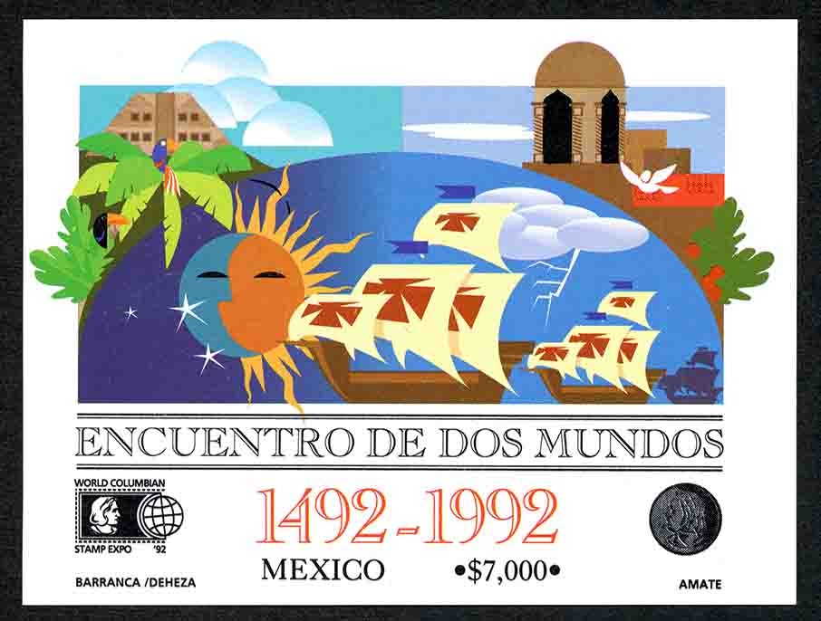 No. Scott: 1735 -- Año de Emisión: 1992 -- Valor facial: Siete Mil Pesos -- Variedad de color: Multicolor -- Sin Perforación -- Tipo de impresión: Offset Hoja Recuerdo Mexicana multicolor, al fondo de la imagen y del lado izquierdo aparece un paisaje con mar, pirámide y palmeras, del lado derecho, la fachada de una iglesia, una paloma en vuelo y vegetación, en la parte frontal aparecen nubes, el sol y la luna y tres carabelas, en la parte inferior de la hoja está escrito "ENCUENTRO DE DOS MUNDOS", "1492-1992", "MEXICO" y el valor facial de "$7000". Para más información favor de dirigirse a biblioteca@mufi.org.mx