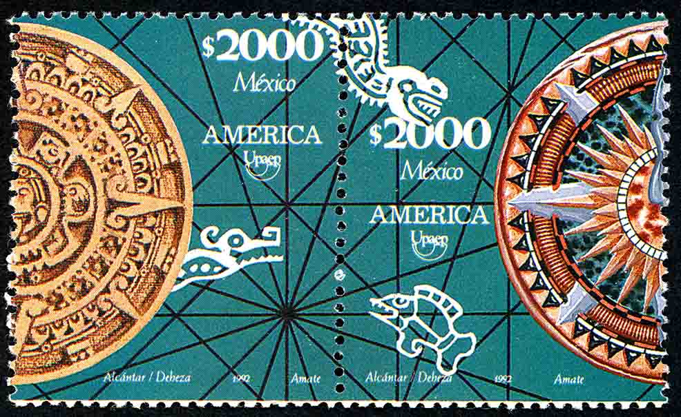 Calendario Azteca, Rosa de los Vientos y Compás -- Sin Marca de Agua -- Con Perforación -- Dos Mil Pesos -- Verde, Azul, Amarillo, Café, Negro No. Scott: 1762-a -- Año de Emisión: 1992 -- Valor facial: Dos Mil Pesos -- Variedad de color: Multicolor -- Con Perforación: 10 -- Tipo de impresión: Offset Tira de dos Timbres Mexicanos en colores verde, azul, amarillo, café y negro, en el timbre del lado izquierdo, aparece parte deL Calendario Azteca, en el timbre del lado derecho, se aprecia parte de una figura llamada Rosa de los Vientos, en ambos timbres está escrito el valor facial de "$2000", "MEXICO" y "AMÉRICA".