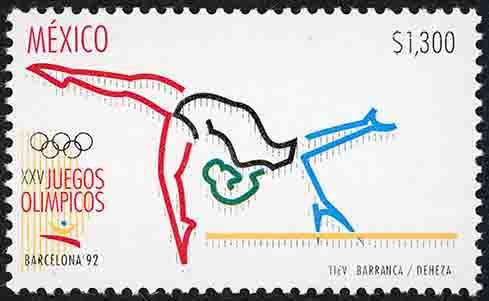 No. Scott: 1741 -- Año de Emisión: 1992 -- Valor facial: Mil Trescientos Pesos -- Variedad de color: Azul, Amarillo, Negro, Verde y Rojo -- Con Perforación: 14 -- Tipo de impresión: Huecograbado Timbre Postal Mexicano en colores azul, amarillo, negro, verde y rojo, en la imagen se observa una silueta humana realizando actividades deportivas de gimnasia, sobre la estampilla también está escrito "MEXICO", "XXV JUEGOS OLÍMPICOS", "BARCELONA 92" y el valor facial de "$1300". Para más información favor de dirigirse a biblioteca@mufi.org.mx