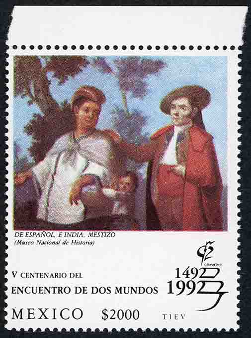 No. Scott: 1728 -- Año de Emisión: 1992 -- Valor facial: Dos Mil Pesos -- Variedad de color: Multicolor -- Con Perforación: 14 x 14 1/2 -- Tipo de impresión: HuecograbadoTimbre Postal Mexicano multicolor, en la imagen se observa una obra del pintor mexicano Jorge González Camarena, titulada "DE ESPAÑOL, E INDIA, MESTIZO, al fondo de la magen se observan algunos árboles poco frondosos, en frente aparecen una mujer, un niño y un hombre, la mujer viste blusa balca, lleva una especie de capa sobre los hombros, en la cabeza tiene una un tocado, en una mano lleva cargando un canasto el cual lleva algún producto que no se puede identificar, luego se observa a un niño pequeño con camisa blanca de manga larga, quien está metiendo la mano en la canasta como queriendo agarrar algo y al final está el hombre con vestimenta española en color rojo y un sombrero en la cabeza, en la parte inferior está escrito "V CENTENARIO DEL ENCUENTRODE DOS MUNDOS", "MEXICO" y el valor facial de "$2000".