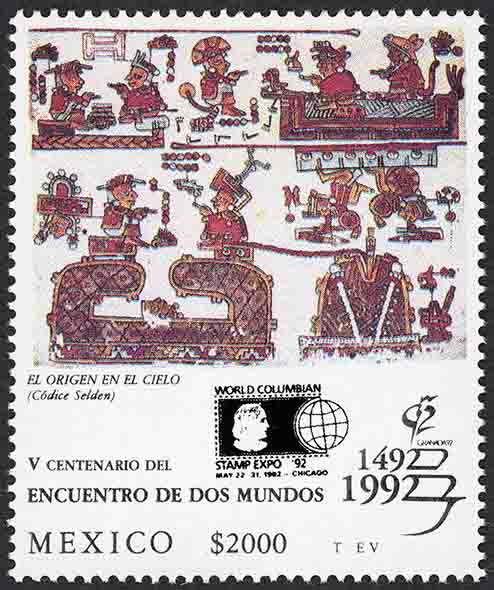 No. Scott: 1729 -- Año de Emisión: 1992 -- Valor facial: Dos Mil Pesos -- Variedad de color: Multicolor -- Con Perforación: 14 x 14 1/2 -- Tipo de impresión: Huecograbado Timbre Postal Mexicano multicolor, en la imagen se observa un manuscrito pictórico perteneciente a alguna cultura prehispánica, que sobrevivieron a la conquista de México, en la parte inferior está escrito "V CENTENARIO DEL ENCUENTRO DE DOS MUNDOS", "MEXICO" y el valor facial de "$2000". También aparece el resello de World Columbian Stamp Expo´92. Para más información favor de dirigirse a biblioteca@mufi.org.mx