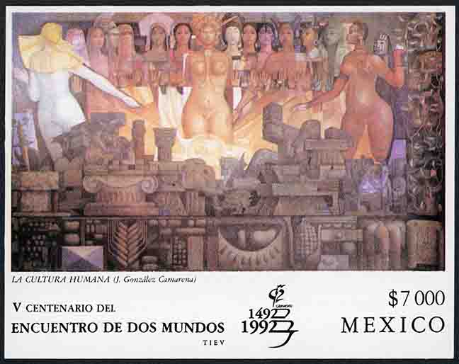 No. Scott: 1731 -- Año de Emisión: 1992 -- Valor facial: Siete Mil Pesos -- Variedad de color: Multicolor -- Con Perforación: 14 x 14 1/2 -- Tipo de impresión: Huecograbado Hoja Recuerdo Mexicana multicolor, en la imagen se observa el mural del pintor mexicano Jorge González Camarena, titulado LA CULTURA HUMANA, en la parte inferior está escrito "V CENTENARIO DEL ENCUENTRO DE DOS MUNDOS", el valor facial de "$7000" y la palabra "MEXICO". Para más información favor de dirigirse a biblioteca@mufi.org.mx