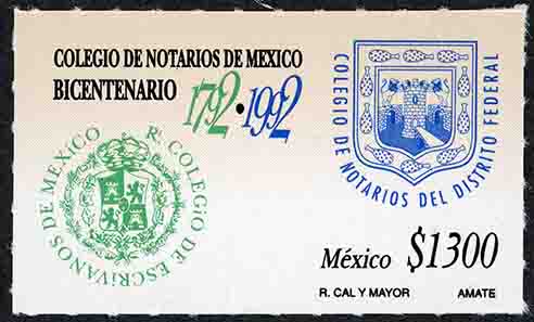 No. Scott: 1736 -- Año de Emisión: 1992 -- Valor facial: Mil Trescientos Pesos -- Variedad de color: Verde, Azul y Negro -- Perforación: 6 1/2 -- Tipo de impresión: Offset Timbre Postal Mexicano en colores verde azul y negro, del lado izquierdo de la imagen está impreso el escudo del colegio de Escribanos y del lado derecho está el Escudo del Colegio de Notarios del Distrito Federal, en la parte superior de la estampilla está escrito "COLEGIO DE NOTARIOS DE MEXICO BICENTENARIO 1792-1992", en la parte inferior "MEXICO" y el valor facial de "$1300". Para más información favor de dirigirse a biblioteca@mufi.org.mx
