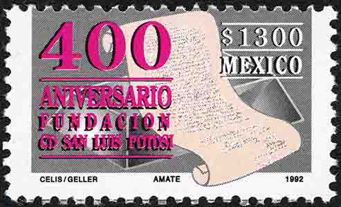 No. Scott: 1777 -- Año de Emisión: 1992 -- Valor facial: Mil Trescientos Pesos -- Variedad de color: Gris, Rojo, Sepia y Negro -- Perforación: 10 -- Tipo de impresión: Offset Timbre Postal Mexicano en colores gris, rojo, sepia y negro, al fondo de la imagen aparece una figura geométrica, no está muy definida puede que sea un trapecio tridimencional, al frente y sobre esta figura se observa un documento con un texto no legible, sobre la estampilla está escrito "400 ANIVERSARIO FUNDACION CD SAN LUIS POTOSÍ", del lado derecho y arriba, el valor facial de "$1300" y la palabra "MEXICO". Para más información favor de dirigirse a biblioteca@mufi.org.mx
