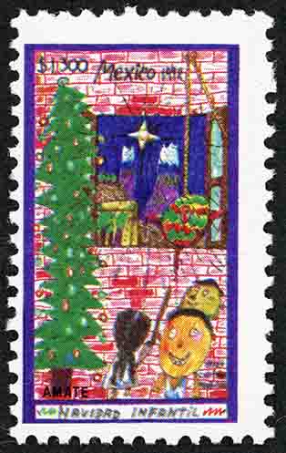 No. Scott: 1780 -- Año de Emisión: 1992 -- Valor facial: Mil Trescientos Pesos -- Variedad de color: Multicolor -- Perforación: 10 -- Tipo de impresión: Offset Timbre Postal Mexicano multicolor el cuál nos presenta una ilustración infantil, al fondo se observa una ventana con motivos navideños, al frente aparece un árbol adornada con motivos navideños, una piñata colgada de una soga y la cara de tres niños, dos de ellos están viendo de frente y una de espaldas, en la parte superior de la imagen está escrito el valor facial de "$1300" y "MEXICO 1992". Para más información favor de dirigirse a biblioteca@mufi.org.mx