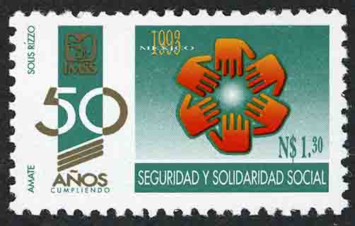 No. Scott: 1809 -- Año de Emisión: 1993 -- Valor facial: 1.30 Nuevos Pesos -- Multicolor -- Perforación: 10 -- Tipo de impresión: Offset Timbre Postal Mexicano multicolor del lado izquierdo de la imagen aparece el logotipo de IMSS y lal frase "50 AÑOS CUMPLIENDO" del lado derecho se observan seis manos unidas formando un círculo, en la parte superior está escrito "MEXICO 1993", en la parte inferior el valor facial de N$1.30 , "SEGURIDAD Y SOLIDARIDAD SOCIAL". Para más información favor de dirigirse a biblioteca@mufi.org.mx