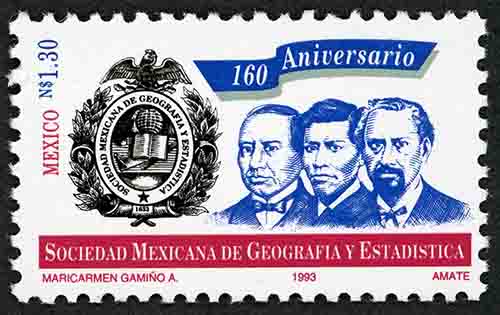 No. Scott: 1813 -- Año de Emisión: 1993 -- Valor Facial: 1.30 Nuevos Pesos -- Azul, negro, rojo -- Perforación: 10 -- Tipo de Impresión: Offset Timbre Postal Mexicano en colores azul, negro y rojo, del lado izquierdo de la imagen aparece el logotipo de la Sociedad Mexicana de Geografía y Estadística, del lado derecho se observan a tres personajes de la historia de México, sobre el costado izquierdo está escrito "MEXICO" y el valor facial de "N$ 1.30", en la parte superior "160 Aniversario" y en la parte inferior "SOCIEDAD MEXICANA DE GEOGRAFÍA Y ESTADÍSTICA". Para más información favor de dirigirse a biblioteca@mufi.org.mx