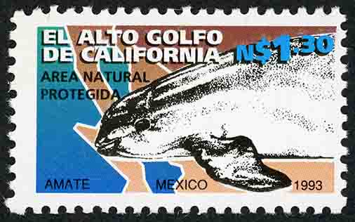 No. Scott: 1817 -- Año de Emisión: 1993 -- Valor Facial: 1.30 Nuevos Pesos -- Azul, café y negro -- Perforación: 10 -- Tipo de Impresión: Offset Timbre Postal Mexicano Multicolor, al fondo de la aimagen se observan algunas figuras no definidas en colores azul, verde y café, al frente aparece, parte de un animal marino en colores blanco y negro, con una aleta lateral, ojos y boca, sobre la estampilla está escrito "EL ALTO GOLFO DE CALIFORNIA", el valor facial de "N$ 1.30", "ÁREA NATURAL PROTEGIDA" y "MEXICO 1993". Para más información favor de dirigirse a biblioteca@mufi.org.mx