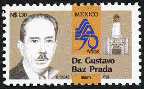 No. Scott: 1823 -- Año de Emisión: 1993 -- Valor Facial: 1.30 Nuevos Pesos -- Multicolor -- Perforación: 10 -- Tipo de Impresión: Offset Timbre Postal Mexicano multicolor, del lado izquierdo de la imagen aparece el valor facial de "N$ 1.30 y el retrato del Dr. Gustavo Baz Prada, en medio está escrito "MEXICO SSA 50 AÑOS", del lado derecho se observa la fachada de un edificio con algunas palabras escritas que no son legibles y el año "1993". Para más información favor de dirigirse a biblioteca@mufi.org.mx