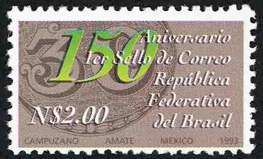 No. Scott: 1824 -- Año de Emisión: 1993 -- Valor Facial: 2.00 Nuevos Pesos -- Gris y verde -- Perforación: 10 -- Tipo de Impresión: Offset Timbre Postal Mexicano en colores gris y verde, al fondo de la imagen se observa un medio círculo con el borde ornamentado, en el centro está impreso el numero "30", sobre de éste aparece el número "150" en color verde, del lado derecho está escrito "Aniversario 1er Sello de Correo República Federativa del Brasil", en la parte inferior el valor facial "N$2.00" y "MEXICO 1993". Para más información favor de dirigirse a biblioteca@mufi.org.mx