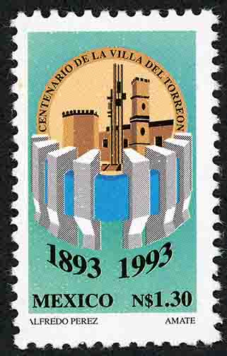 No. Scott: 1830 -- Año de Emisión: 1993 -- Valor Facial: 1.30 Nuevos Pesos -- Verde claro, sepia, negro, azul y gris -- Perforación: 10 -- Tipo de impresión: Offset Timbre Postal Mexicano en colores verde claro, sepia, negro, azul y gris, al fondo se observan edificios de una población de la Edad Media, al frente, parte de una escultura urbana, representada por un aro de acero en colores gris y azul, en la parte superior está escrito "CENTENARIO DE LA VILLA DE TORREÓN", en la parte inferior "1893-1993", MEXICO", el valor facial de "N$ 1.30" y "ALFREDO PEREZ AMATE". Para más información favor de dirigirse a biblioteca@mufi.org.mx