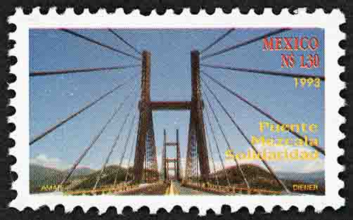 No. Scott: 1845 -- Año de Emisión: 1993 -- Valor facial: 1.30 Nuevos Pesos -- Multicolor -- Perforación: 10 -- Tipo de Impresión: Offset Timbre Postal Mexicano multicolor, en la imagen se aprecia parte del puente Mezcala Solidaridad, el cuál se ubica en el Puerto de Acapulco, perteneciente al Estado de Guerrero, en la parte lateral del lado derecho, está escrito "MEXICO", el valor facial de "N$1.30", "1993" y "Puente Mezcala Solidaridad" Para más información favor de dirigirse a biblioteca@mufi.org.mx