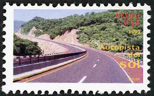 No. Scott: 1846 -- Año de Emisión: 1993 -- Valor Facial: 1.30 Nuevos Pesos -- Multicolor -- Perforación: 10 -- Tipo de Impresión: Offset Timbre Postal Mexicano multicolor, en la imagen se observa una vía de circulación de dos bandas, una para cada sentido, separadas entre sí por vallas de protección, alrededor hay montañas con extensa vegetación, sobre la estampilla está escrito "MEXICO", el valor facial de "N$1.30", "1993"y "Autopista del Sol". Para más información favor de dirigirse a biblioteca@mufi.org.mx