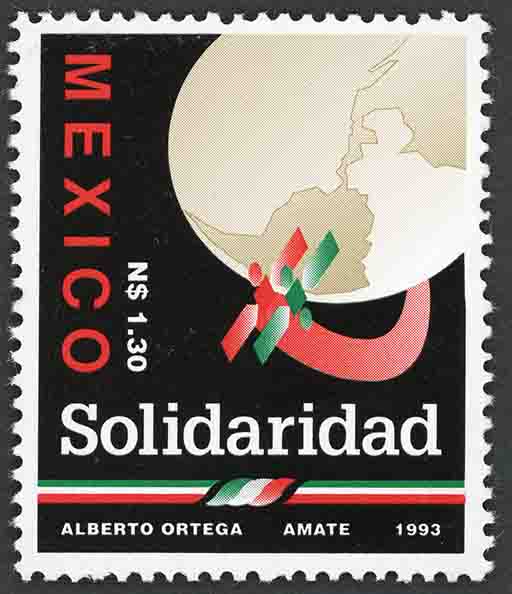 No. Scott: 1842 -- Año de emisión: 1993 -- Valor facial: 1.30 Nuevos pesos -- Negro, sepia, rojo y verde -- Perforación: 10 -- Tipo de impresión: Offset Timbre Postal Mexicano en colores negro, sepia, rojo y verde, en la parte superior se observa la ilustración de la tierra y un objeto que gira en torno a ella, sobre la estampilla está escrito "MEXICO", el valor facial de "N"1.30", "Solidaridad" y "ALBERTO ORTEGA AMATE 1993". Para más información favor de dirigirse a biblioteca@mufi.org.mx