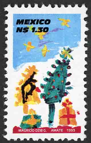 No. Scott: 1841 -- Año de Emisión: 1993 -- Valor Facial: 1.30 Nuevos Pesos -- Multicolor -- Perforación: 10 -- Tipo de Impresión: Offset Timbre Postal Mexicano multicolor, en él aparece una ilustración infantil, mostrándo dos árboles adornados con motivos navideños, debajo de ellos hay algunos objetos coloridos, en la parte superior está escrito "MEXICO", el valor facial de "N$ 1.30" y en la parte inferior "MAURICIO DZIB G., AMATE, 1993". Para más información favor de dirigirse a biblioteca@mufi.org.mx