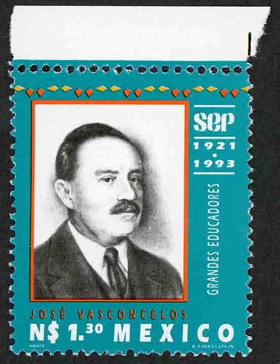 No. Scott: 1852 -- Año de Emisión: 1994 -- Valor Facial: 1.30 Nuevos Pesos -- Azul, negro, rojo y amarillo -- Perforación: 10 -- Tipo de Impresión: Offset Timbre Postal Mexicano en colores azul, negro, rojo y amarillo, en la imagen se observa el retrato del abogado, pensador y escritor mexicano José Vasconcelos, en el contorno derecho está escrito "SEP 1921-1993", "GRANDES EDUCADORES" , en la parte inferior "JOSÉ VASCONCELOS", el valor facila de "N$ 1.30" y la palabra "MEXICO". Para más información favor de dirigirse a biblioteca@mufi.org.mx
