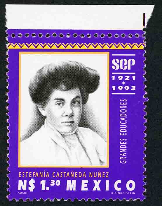 No. Scott: 1854 -- Año de Emisión: 1994 -- Valor Facial: 1.30 Nuevos Pesos -- Violeta, negro y amarillo -- Perforación: 10 -- Tipo de Impresión: Offset Timbre Postal Mexicano en colores violeta, negro y amarillo, en la imagen se observa el retrato de la profesora y fundadora del jardín de niños en México Estefanía Castañeda Núñez, en el contorno derecho está escrito "SEP 1921-1993", "GRANDES EDUCADORES", en la parte inferior "ESTEFANIA CASTAÑEDA NUÑEZ", el valor facial de "N$ 1.30" y la palabra "MEXICO". Para más información favor de dirigirse a biblioteca@mufi.org.mx