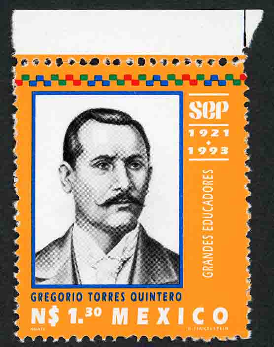No. Scott: 1857 -- Año de Emisión: 1994 -- Valor Facial: 1.30 Nuevos Pesos -- Amarillo, negro, azul, verde y rojo -- Perforación: 10 -- Tipo de Impresión: Offset Timbre Postal Mexicano en colores amarillo, negro, azul, verde y rojo, en la imagen se observa el retrato del profesor y pedagogo mexicano Gregório Torres Quintero, en el contorno derecho está escrito "SEP 1921-1993", "GRANDES EDUCADORES", en la parte inferior "GREGORIO TORRES QUINTERO", el valor facial de "N$ 1.30" y la palabra "MEXICO". Para más información favor de dirigirse a biblioteca@mufi.org.mx