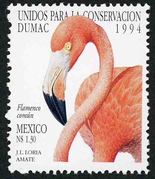 No. Scott: 1864 -- Año de Emisión: 1994 -- Valor Facial: 1.30 Nuevos Pesos -- Rosa, negro y amarillo -- Perforación: 10 -- Tipo de Impresión: Offset Timbre Postal Mexicano en colores rosa, negro y amarillo, en la imagen se observa a una ave acuática, con cuello largo, pico color blanco y negro corvado hacia abajo, su cuerpo es robusto, cubierto con plumaje en color rosa, en la parte superior está escrito "UNIDOS PARA LA CONSERVACION DUMAC 1994", en la parte superior del lado izquierdo "Flamenco común", "MEXICO", el valor facial de "N1.30" y "J, L. LORIA AMATE". Para más información favor de dirigirse a biblioteca@mufi.org.mx